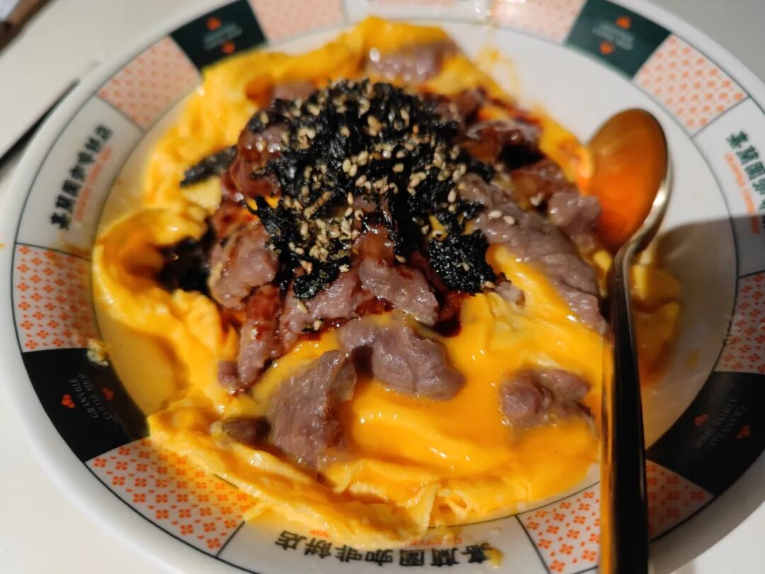 滑蛋牛肉饭,一大碗,吃得发撑。