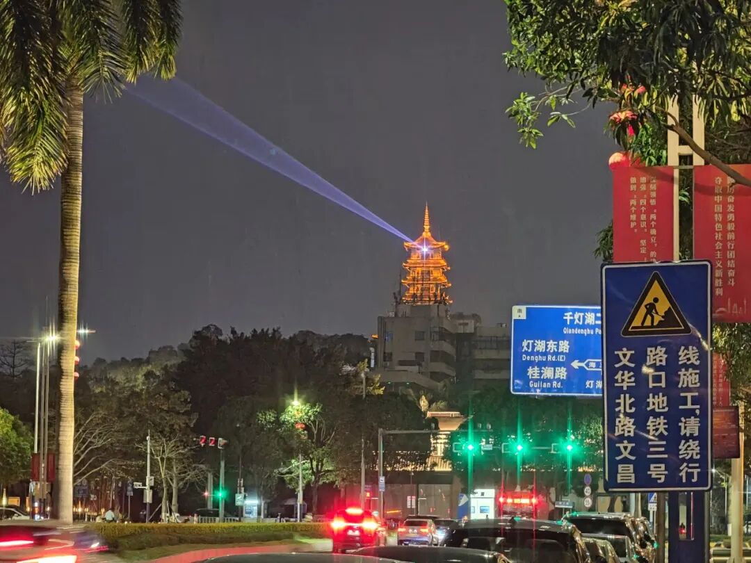 过马路时,看到魁星阁上射出一道光。