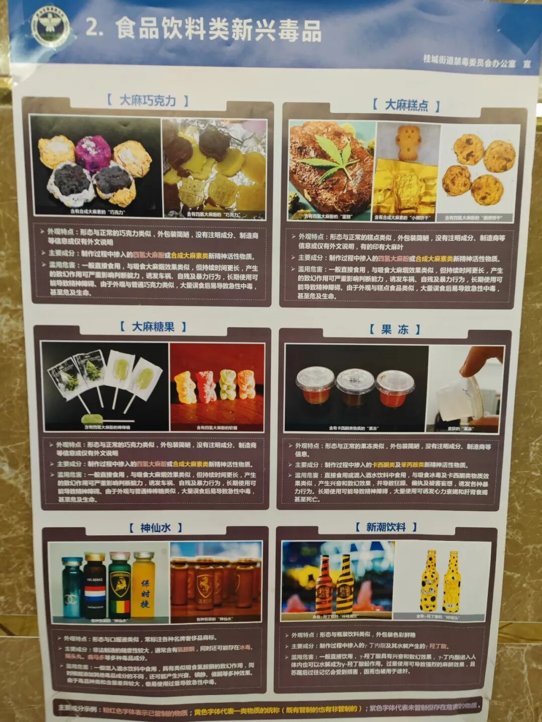 吃饱了回酒店,电梯口张贴着一张海报,这些毒品看起来很像食物饮料,我也拍一张科普一下。