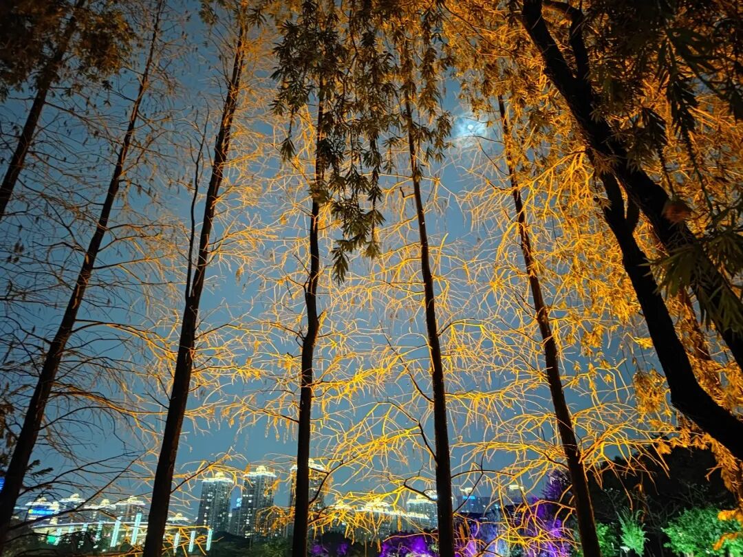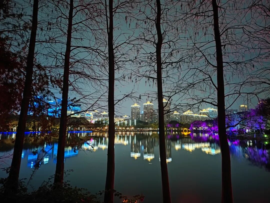 湖边的树上也挂满了彩灯,时亮时暗。