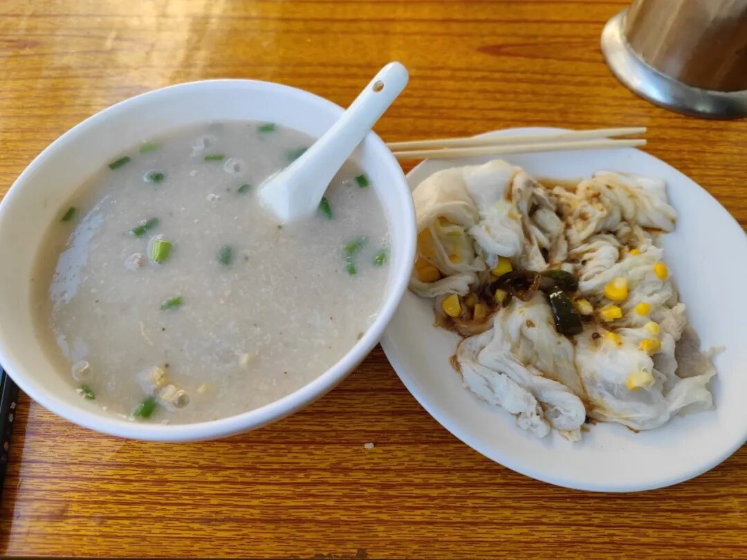 一份玉米瘦肉肠粉和一碗猪杂粥,吃饱肚子出发。