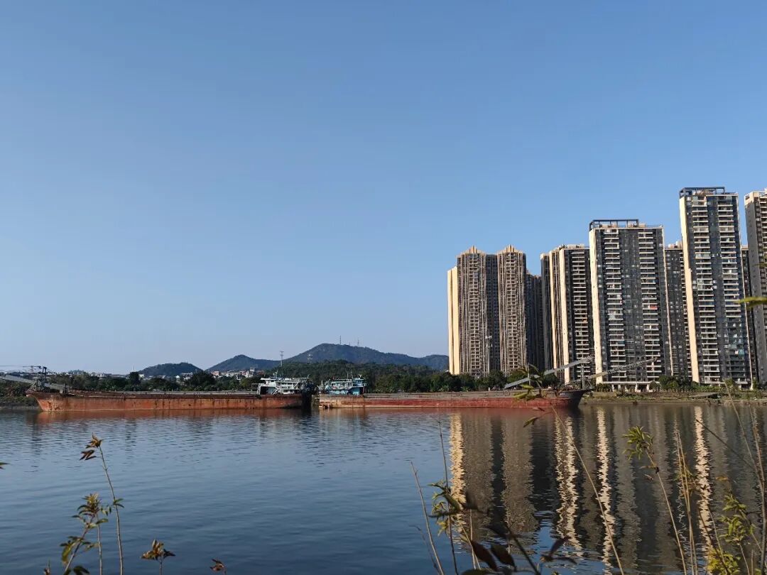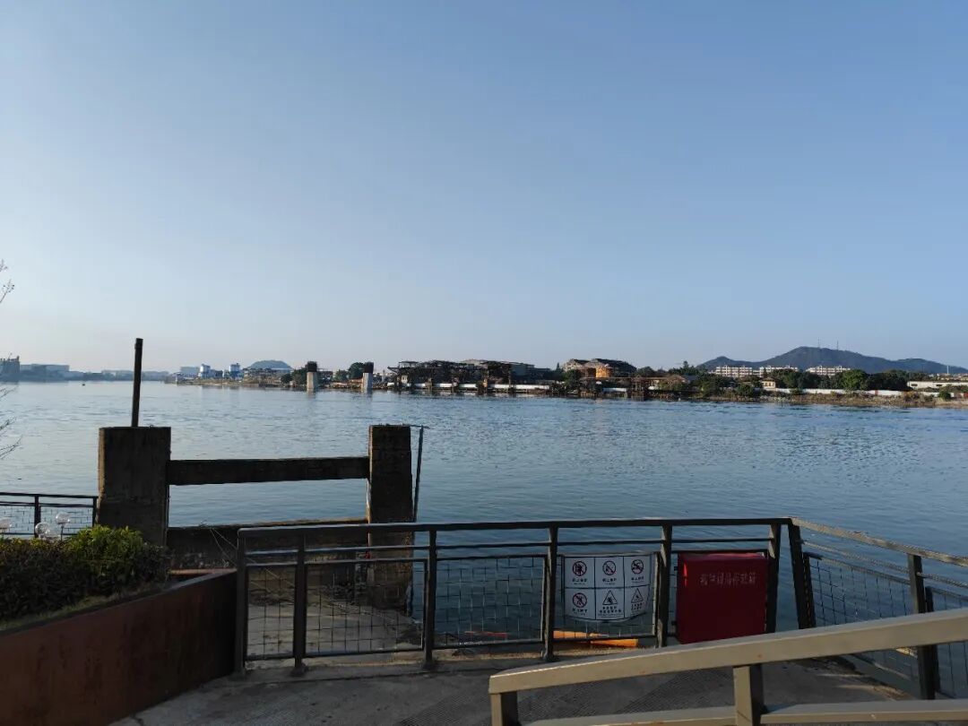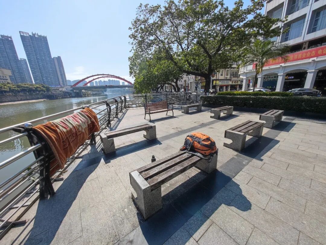 要去顺德,公交车站在昨晚的河边,等了一会儿车也不来,坐在椅子上,把背包放下。