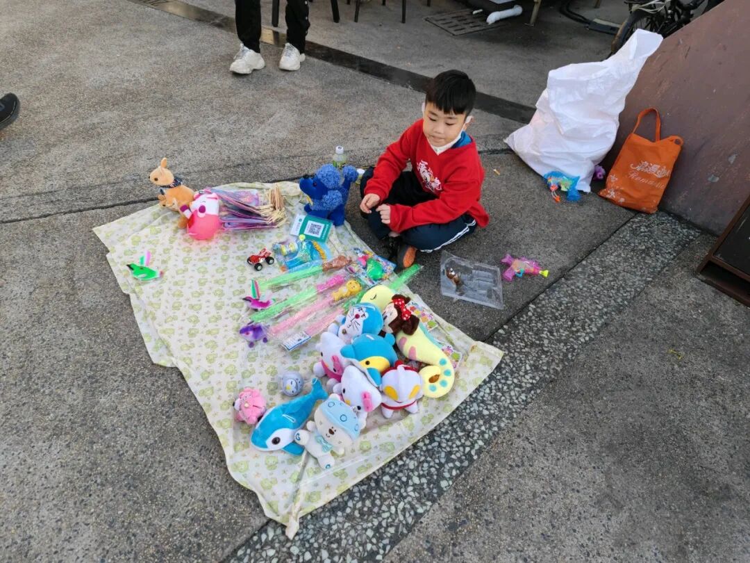 一个小孩儿也在摆摊,卖他自己的玩具,这是准备换了零花钱去干嘛?