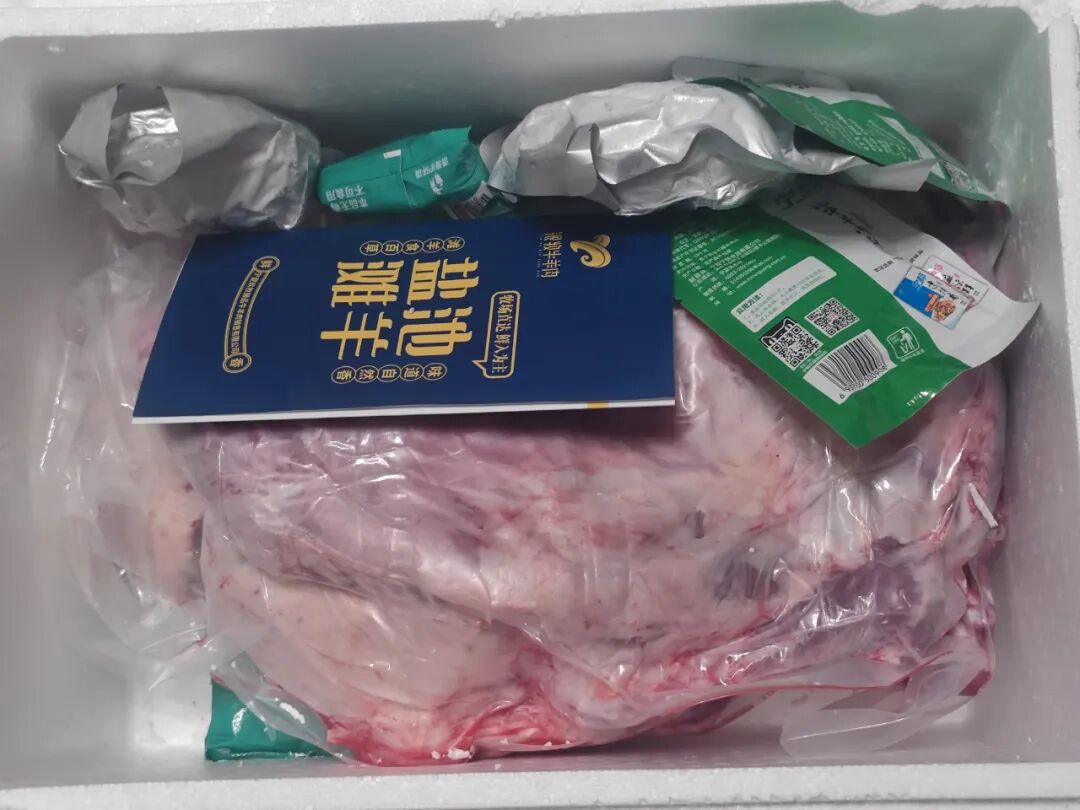 好大的一个箱子,里面密封着一大块沉甸甸的羊肉,不是冰冻的,箱子里有冰袋,感觉像刚宰杀完不久。