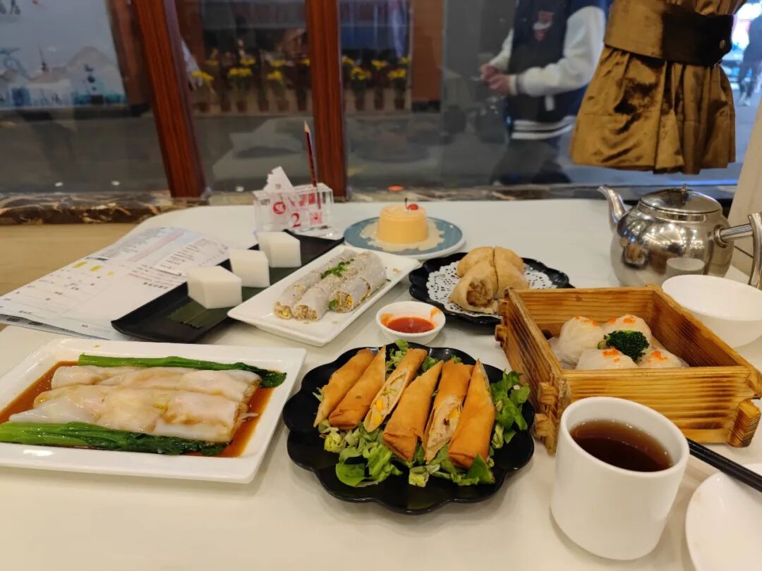 猪肠碌是阳江特色,粉皮裹着碎米粉和豆芽;咸水角我也没吃过,炸的糯米外皮里面是肉馅;肠粉、春卷、虾饺是传统的早茶品种;还点了椰汁糕和芒果布丁的甜品。
