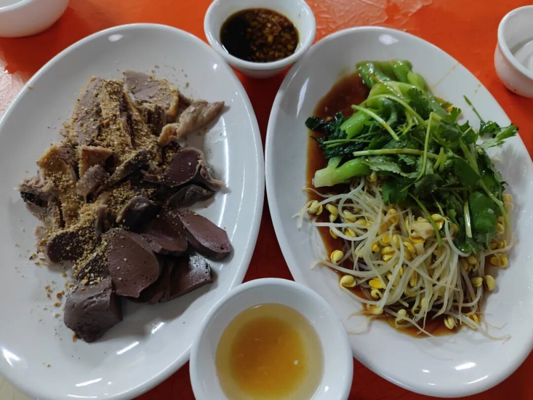 我点了半斤鸭肉鸭杂,半盘蔬菜。鸭肉上撒着花生芝麻碎,蔬菜是豆芽和水东芥菜,广东电白特产。