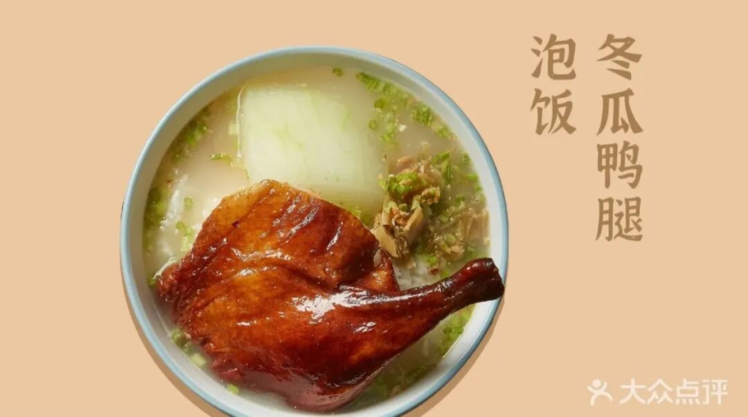 我当年最喜欢的一道菜,叫陈皮冬瓜鸭腿泡饭,打包送到办公室的时候,浸泡着一整块冬瓜、很多瘦肉粒的汤单独装一个圆形打包盒,另一个打包盒里是米饭和一整只表皮酥脆的烧鸭腿。