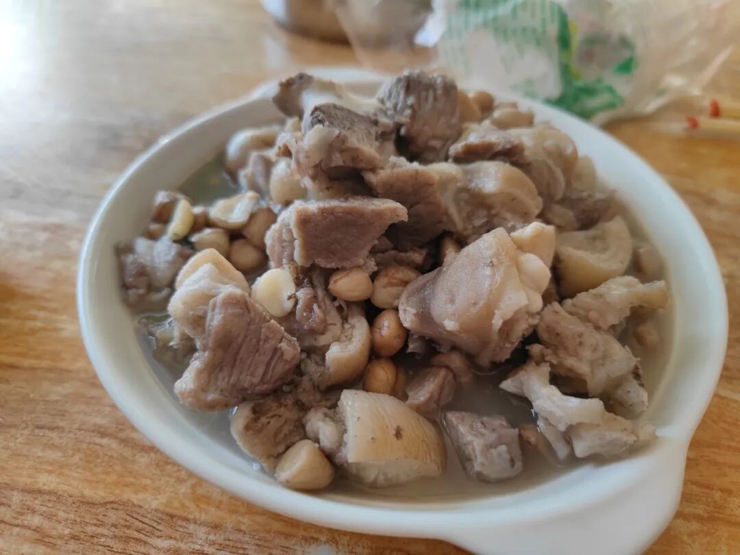 走国道,在路边找了家饭馆,这里没有菜单,自己看着冰柜里的食材点,我也不知道怎么点,看着有一盆做好的肉还不错,就点了这个,猪脚花生,配米饭。