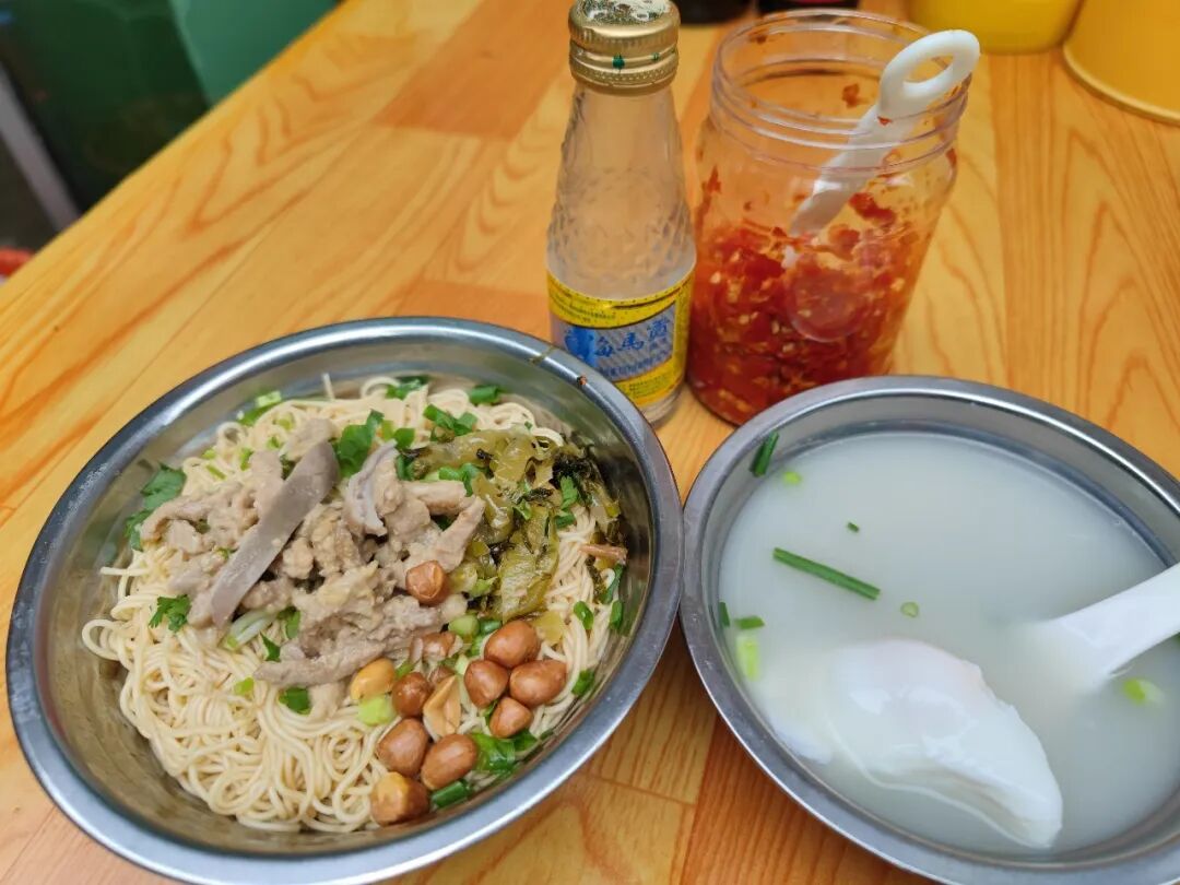 我觉得“腌面”就是干拌面,12块钱,里面好多瘦肉,还有猪肚。送一碗汤,2元里面加个蛋。