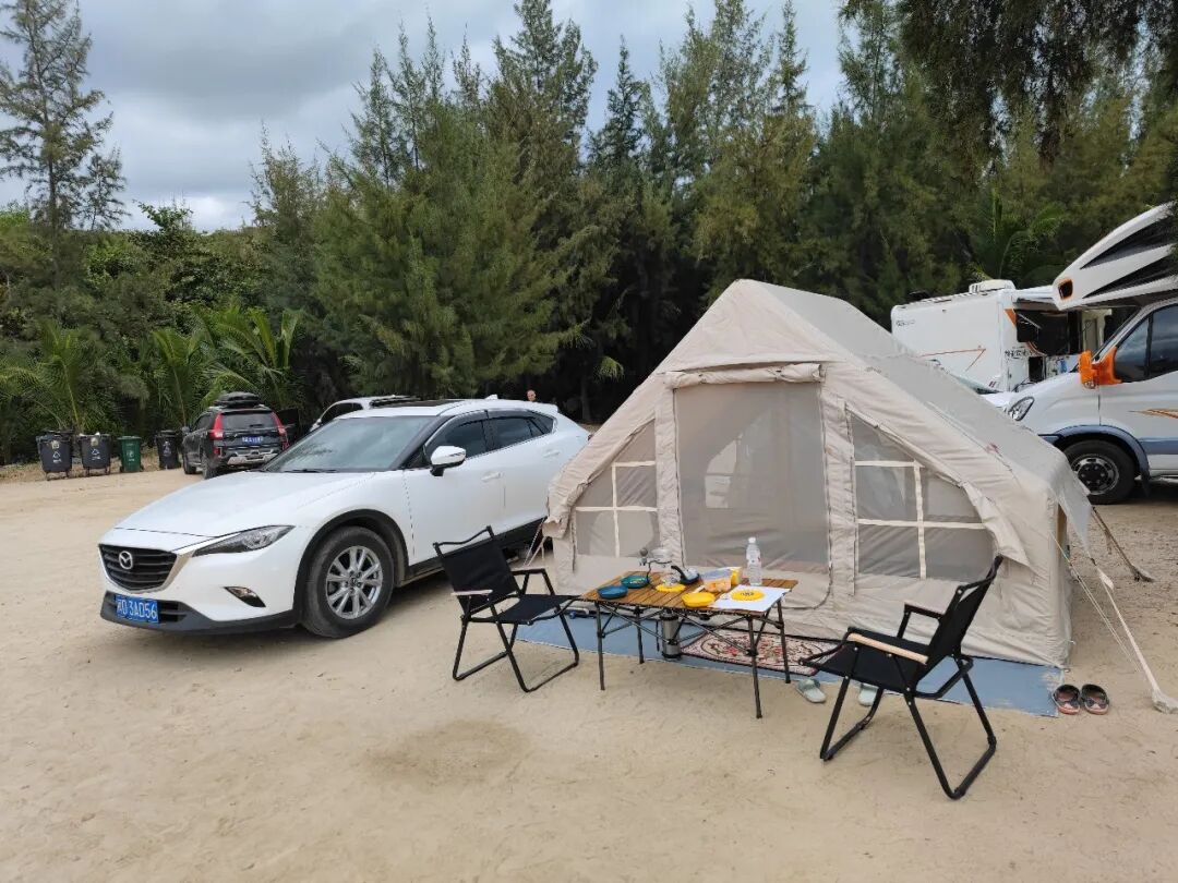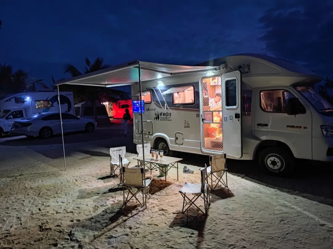 房车远景,背山面海,椰林沙滩,帐篷桌椅,好不自在。