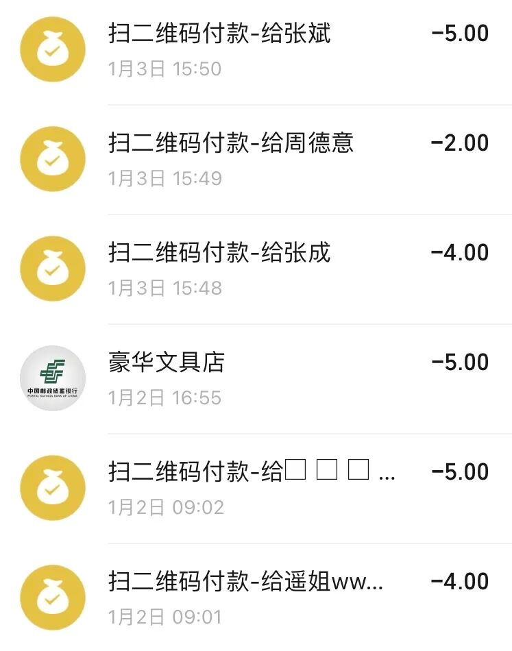 小账单,从上到下:5元的一大袋瓜子、2元的20个火龙果、4元的1斤桂圆、5元的一个大椰子、5元的3斤早市芒果、4元的早市蔬菜。