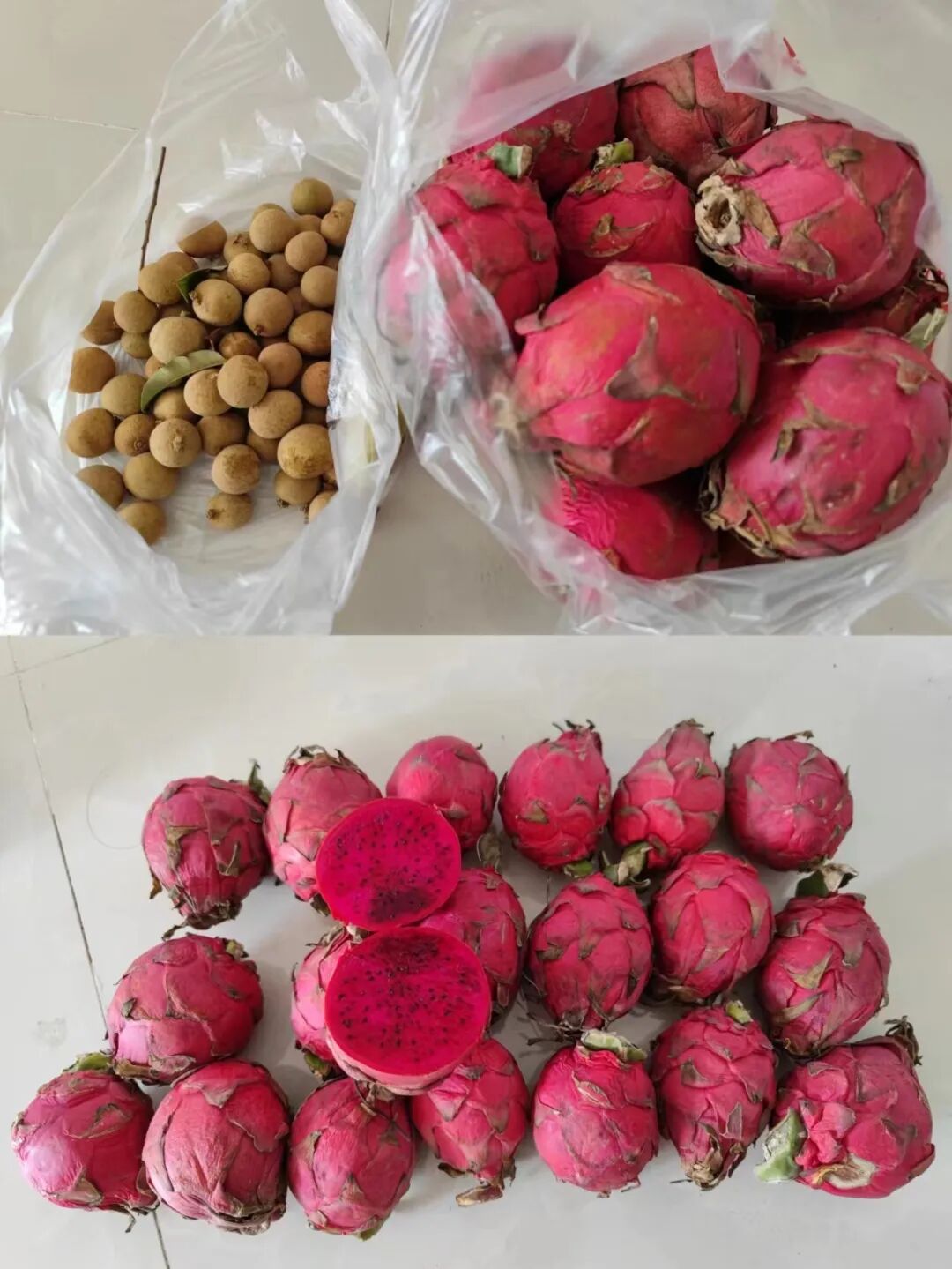 在小区门口买了鲜桂圆和火龙果。桂圆一斤4元,火龙果20个2元。你没看错,是20个一共2元,1毛一个。