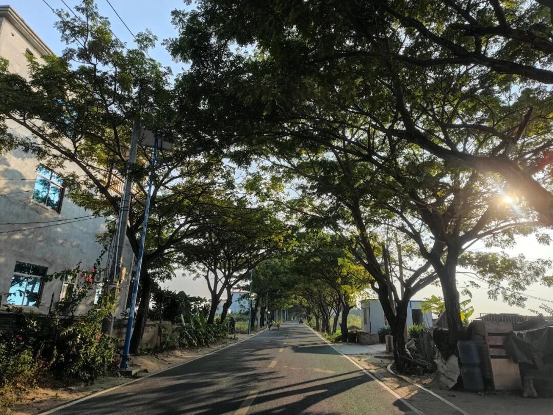 顺着地图,走过一条被道两旁树围成拱形的小路,又穿过一片村庄。