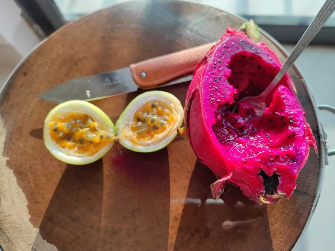 1.5元1斤的火龙果,买了3个,4元。特别喜欢蹲在阳光里吃水果的感觉,眼前亮亮的,脸上暖暖的、嘴里甜甜的。