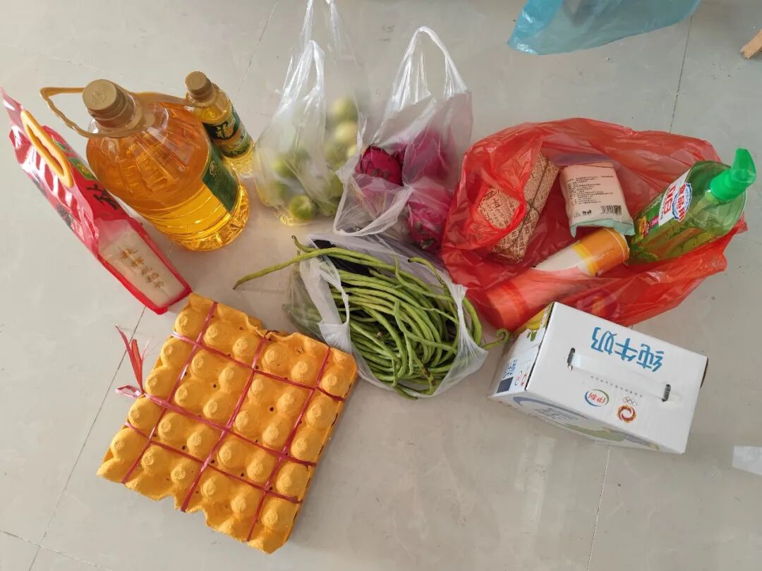 米、油、鸡蛋、牛奶、挂面、洗涤灵、刷碗布、一罐榨菜和一袋桃酥。