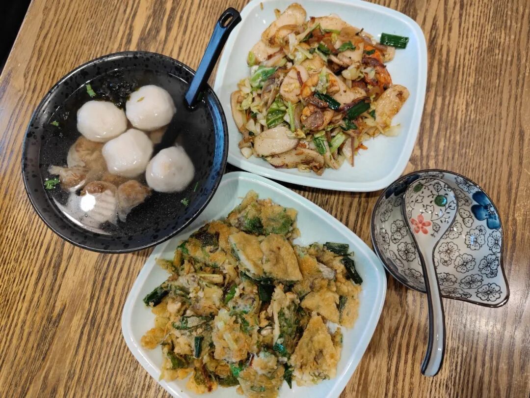 从下往上,海蛎煎、鱼丸肉燕汤、炒白粿(类似年糕)。