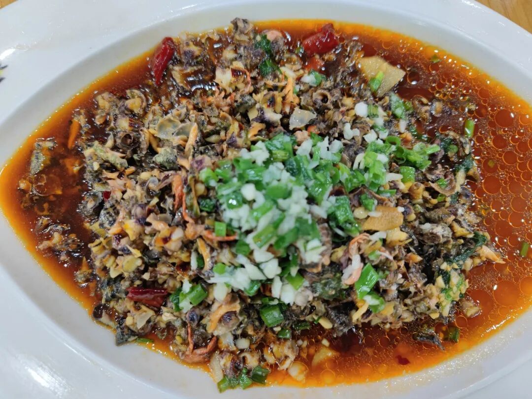 葱油碎螺。招牌菜,打碎的小螺,壳比肉多,味道还行。我觉得这道菜的意义在于下酒,类似北京的猴皮筋儿蘸酱油和锈铁钉。但我已戒酒,这道菜就没什么吃头儿了。