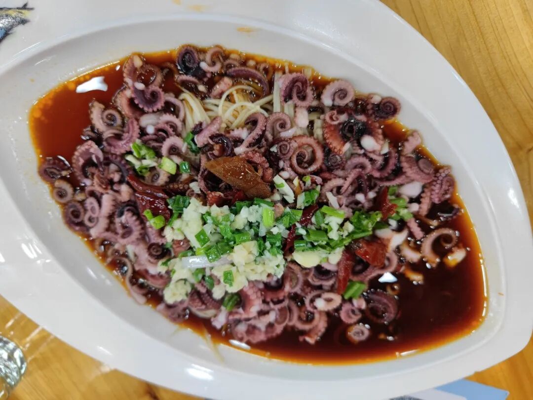 葱油八爪鱼须。下面铺了一层金针菇,还不错。