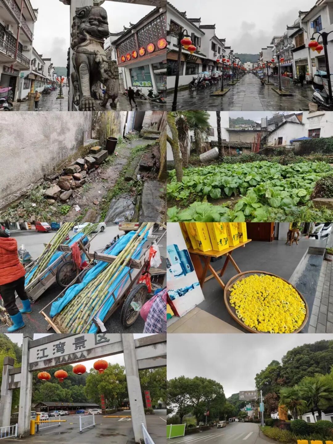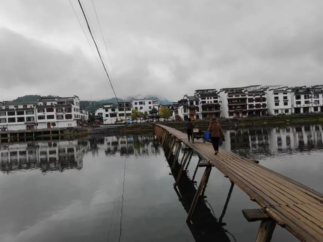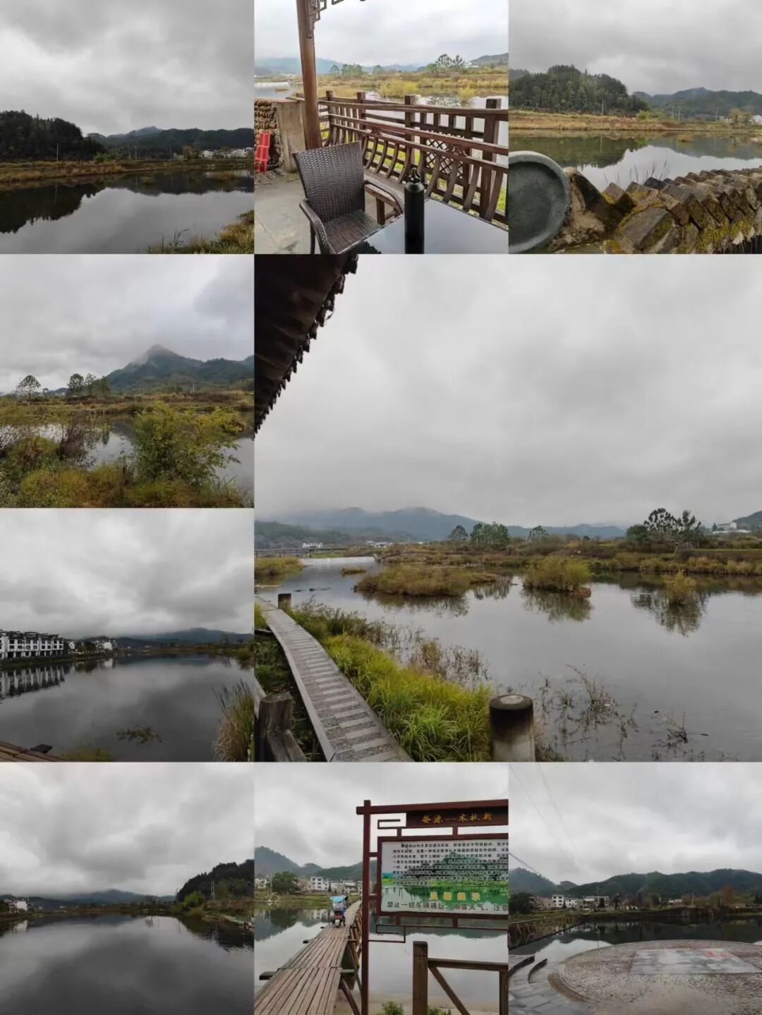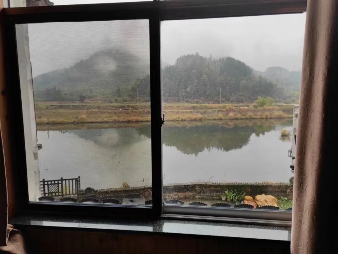 鸭子在江上游弋,远山笼罩在云雾中。耳边只有水流过落下小坝的哗哗声,空气温润,脸上的皮肤湿润饱满。民宿坐落在江畔,白墙青瓦点缀着深绿的山林。美不胜收。