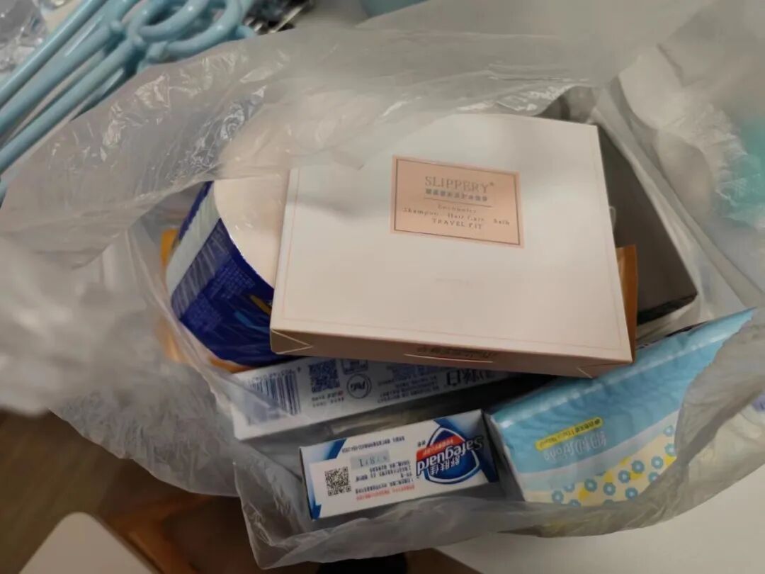 没有电视,其他条件确实比之前的隔离点要好。客厅的桌子上,放了10瓶水和一大包的生活洗漱用品,全新的,看起来还挺好的,我不舍的用,只有3天,拆开用不了多少,太浪费了。