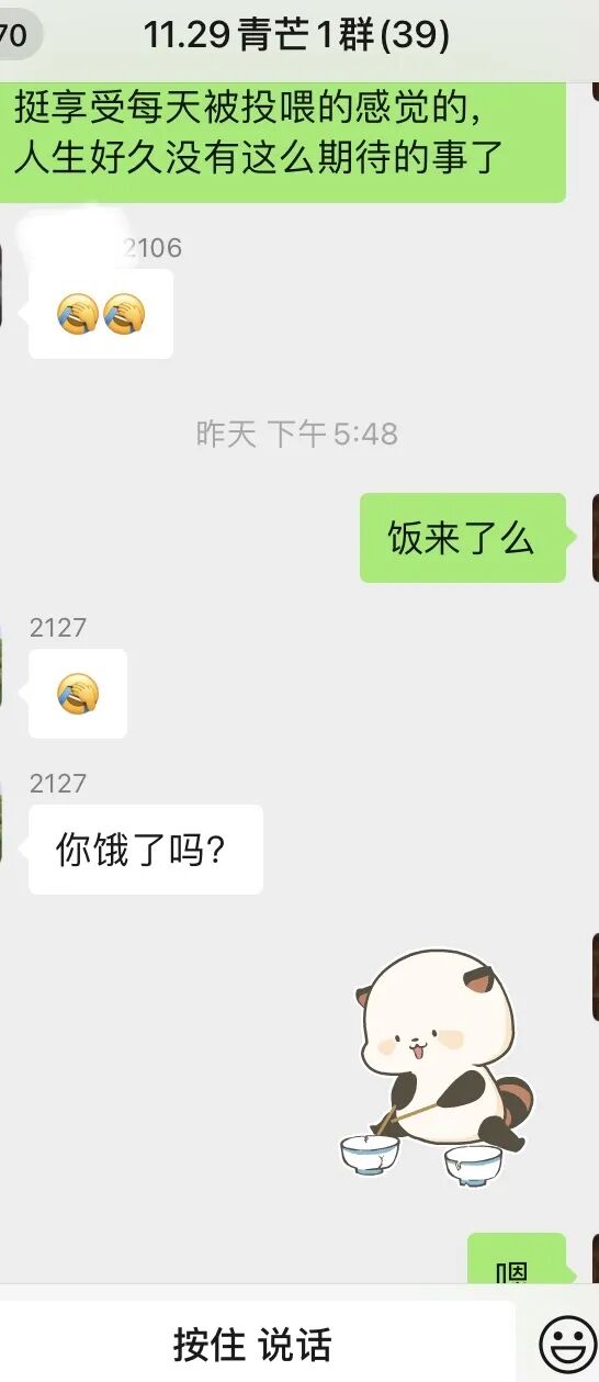 进来时我们一起加入了一个微信群,在里面提各种诉求,我问的最多的是:饭怎么还没来?