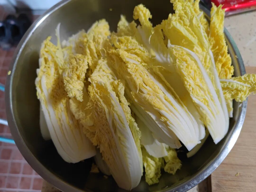 然后加水,加盐、鸡精、胡椒粉和浓汤宝,下切成条的娃娃菜,煮5分钟。