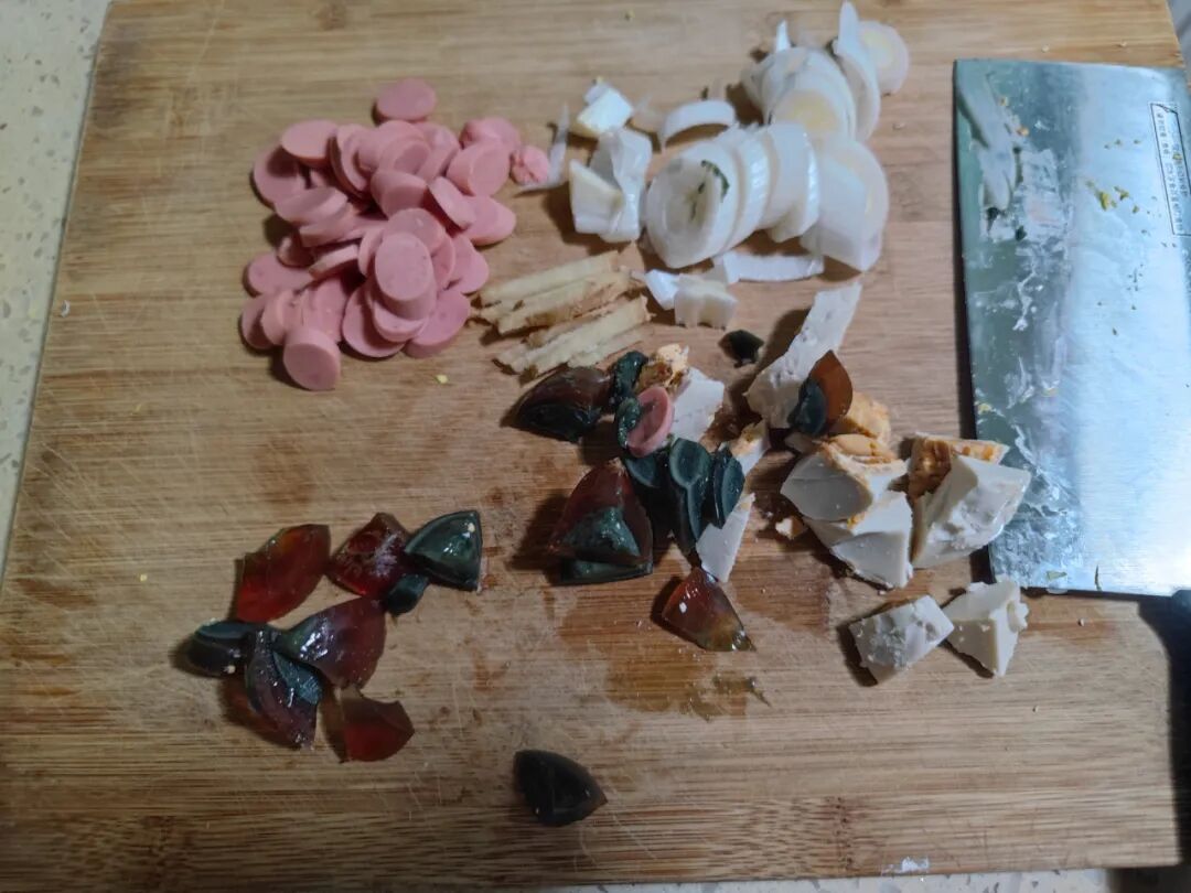 上汤是关键,切葱、姜、火腿肠、皮蛋和咸鸭蛋,在底油里中火炒。