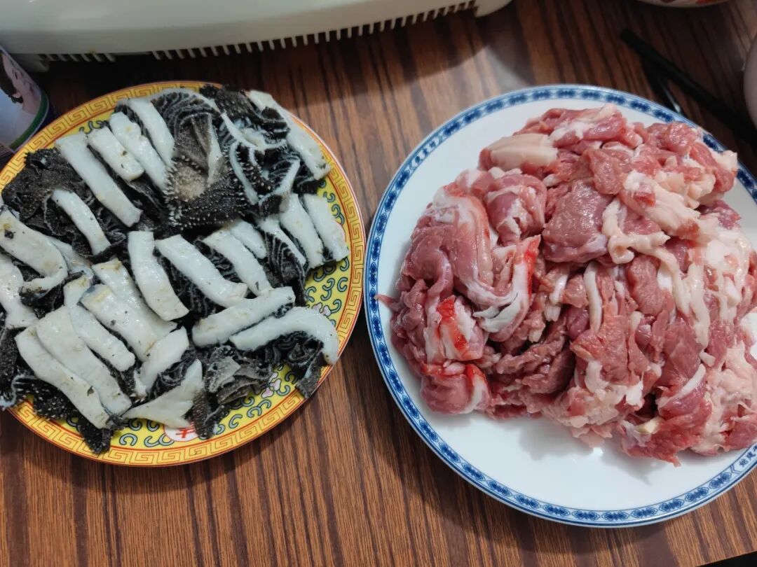 右面这盘带皮羊肉,是从蝎子上剔下来切的。左面的百叶,是爆肚最好的原料。