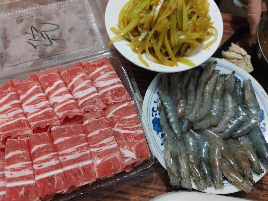 还有羊肉卷和收拾好的大虾。