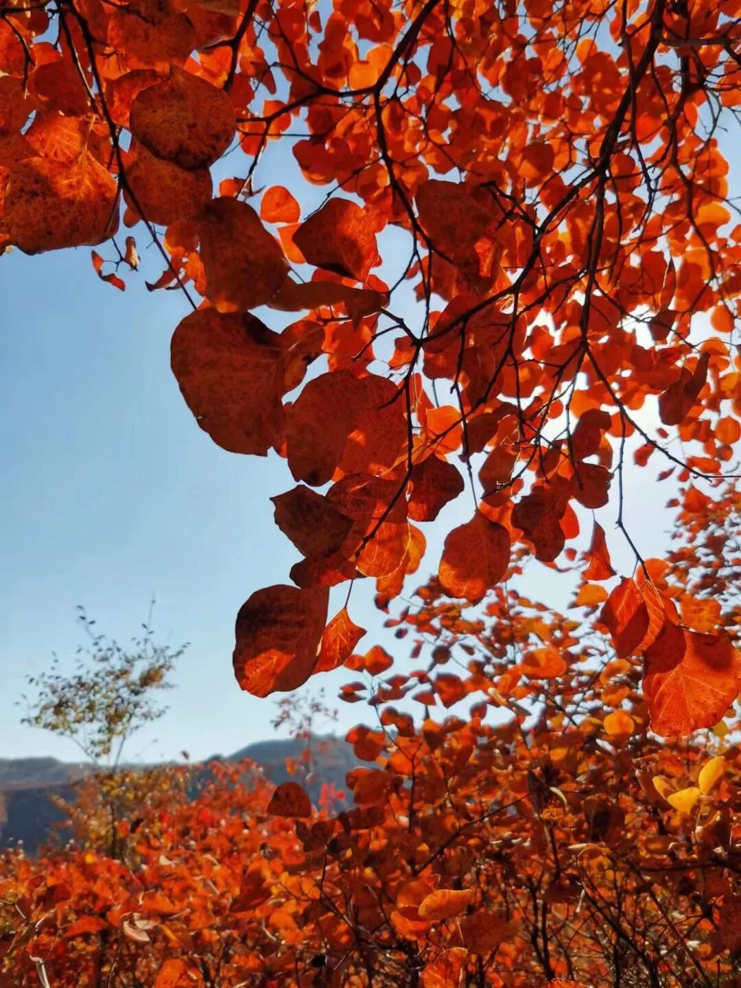 这个秋天,凉了又暖,灿黄的银杏叶和火红的枫叶,刚刚被冷一下子做好了让北风带走的准备,气温就又升了,于是它们抖擞精神在树枝上挂啊挂,接受路人一次次的拍摄,好好的过足了网红的瘾。