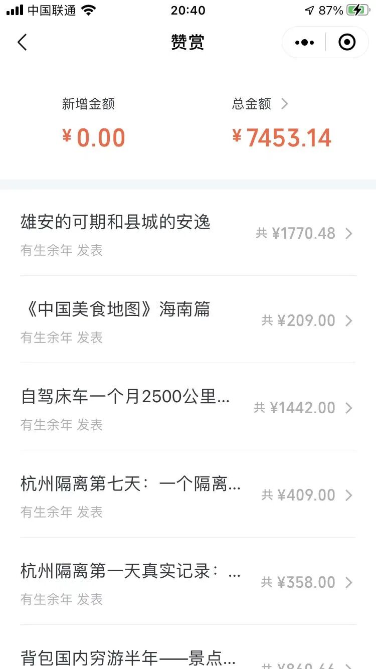 主要是打赏。我以前开打赏看心情很随机,现在固定一个月开一次,有两个收打赏的账号,一个截至目前收了7453.14元。