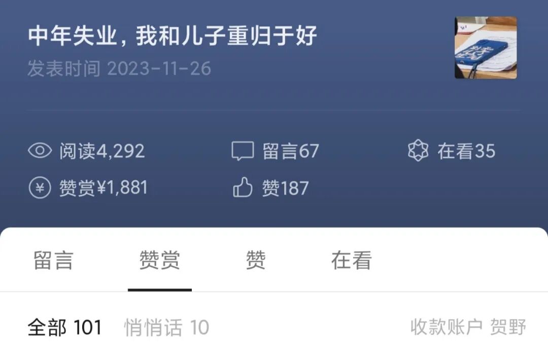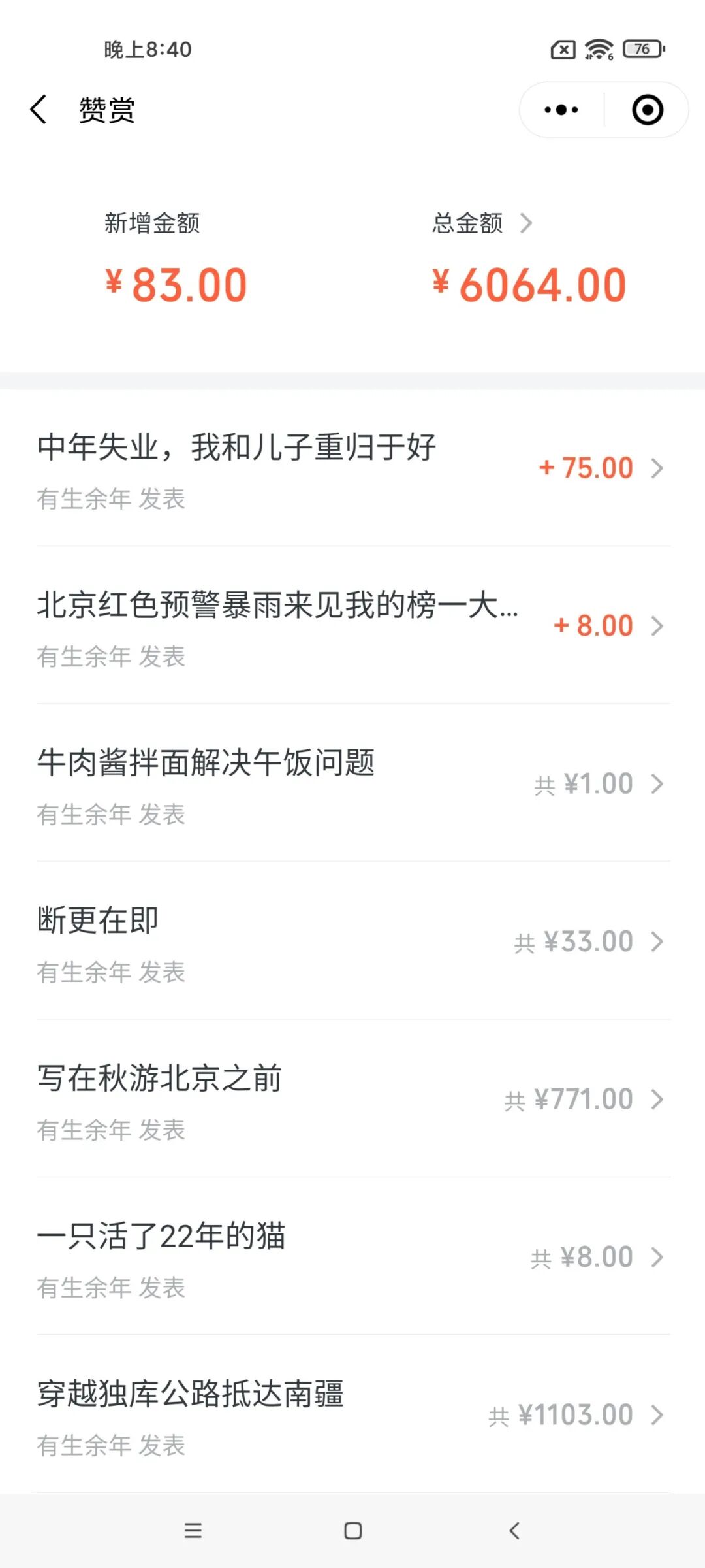 打赏主要是熟人给的,我妈一个人就打赏了将近2000元,我的姨们等亲戚、以前的同学同事等朋友,占到了打赏的85%。刚开始开打赏的时候,每篇都是家里人打赏,后来我都不好意思开了。
