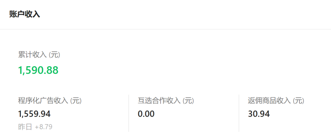 这部分不是很高,主要来源于文章底部的广告展现和点击收入,是微信公众号平台给的,这部分钱我没提取过,目前合计1590.88元。