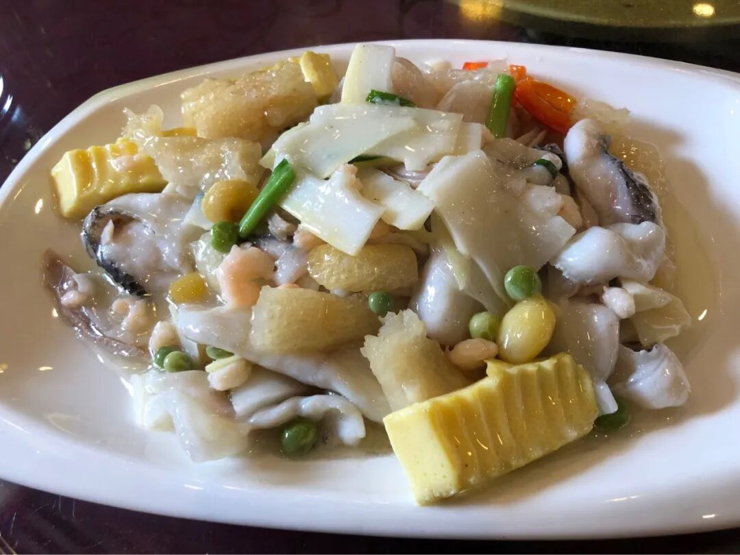 白什盘。里面有鱼片、虾仁、笋、猪皮、银杏、豌豆等,很鲜。