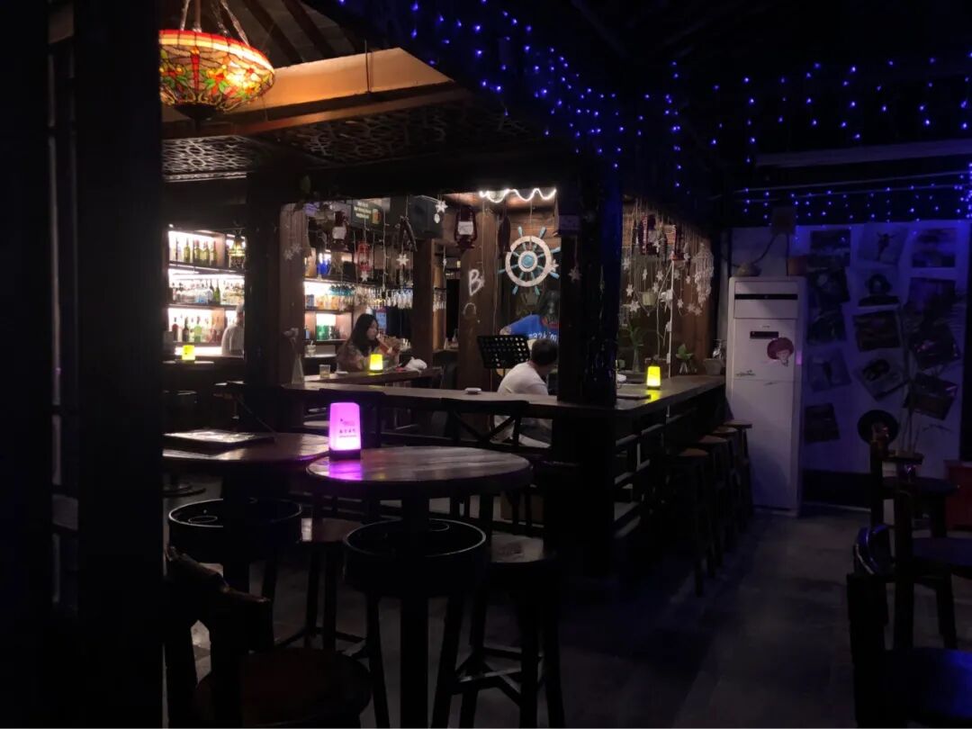一家酒吧,在外面通过窗户可以看到里面。这条街上的酒吧不多。