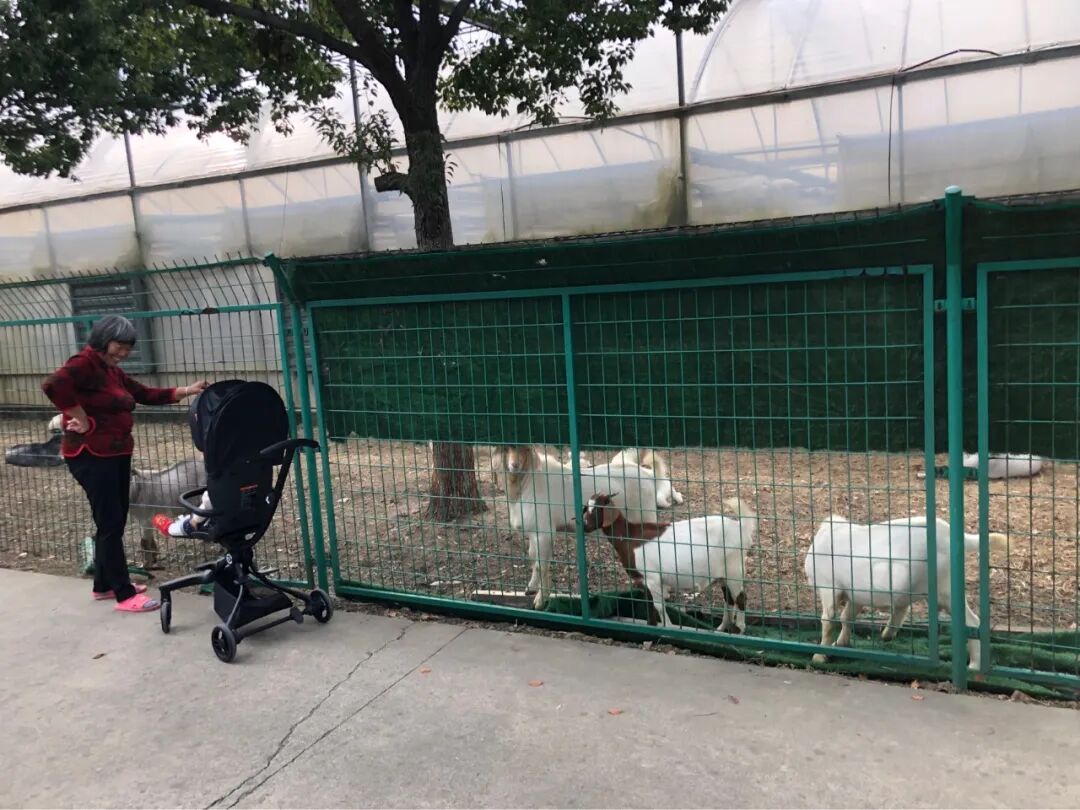 阿婆带着孙子在逗羊。我在村子里养成了坏习惯,遇到什么动物就学什么声音冲它们叫,“咩~”。