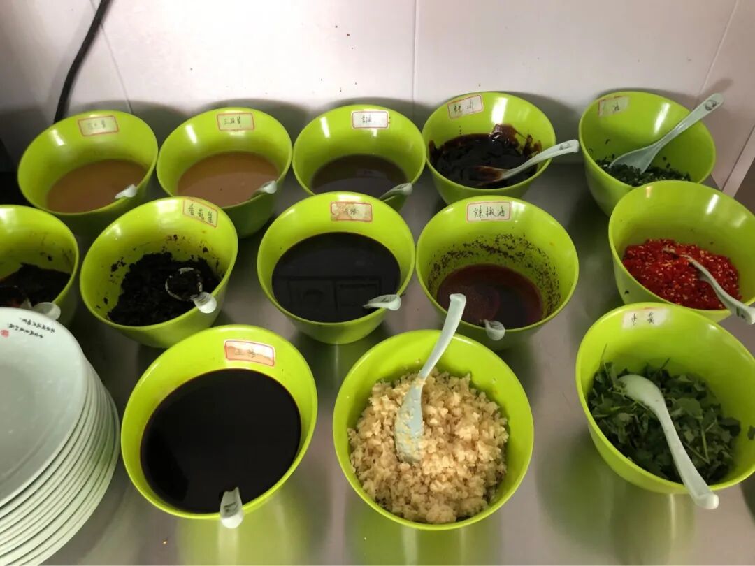 店里还有小料自取,还有一整个冰柜的类似麻辣烫似的自取凉菜、涮菜。