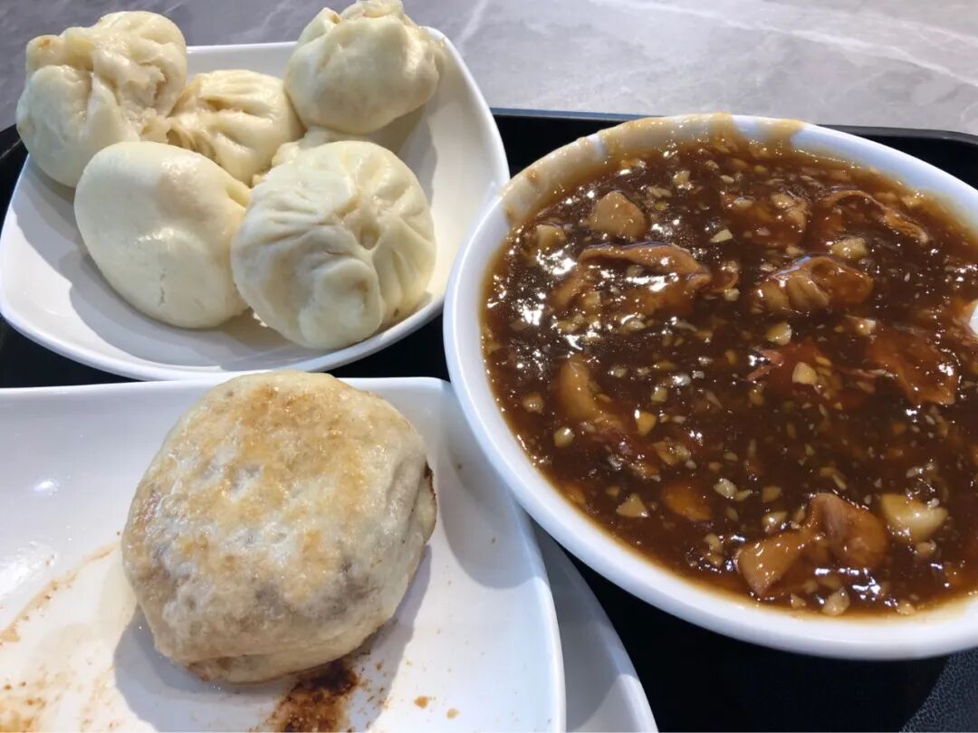 在南城找了家早点,炒肝包子加一个门钉肉饼。