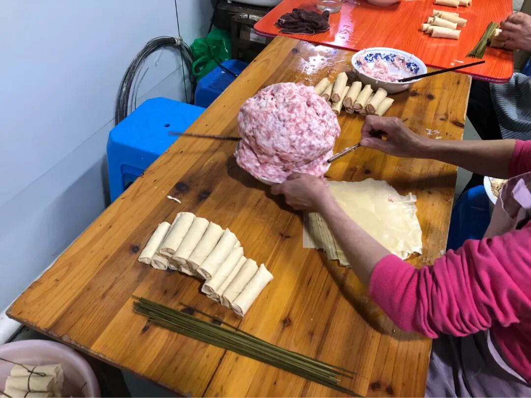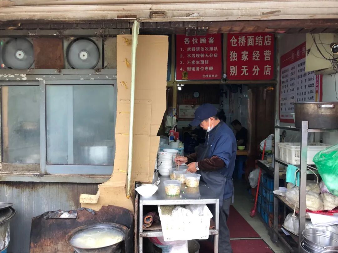 不起眼的小店,卖宁波最火的面结,用豆皮包裹的肉馅。我到的时候大概10点半,还不营业,里面的人都在忙着卷面结。这家店的营业时间很奇怪,早6:30-9:00,11:00-12:30。中间的两个小时,为啥要休息呢?一直营业不好么?