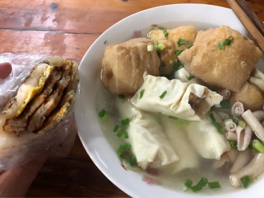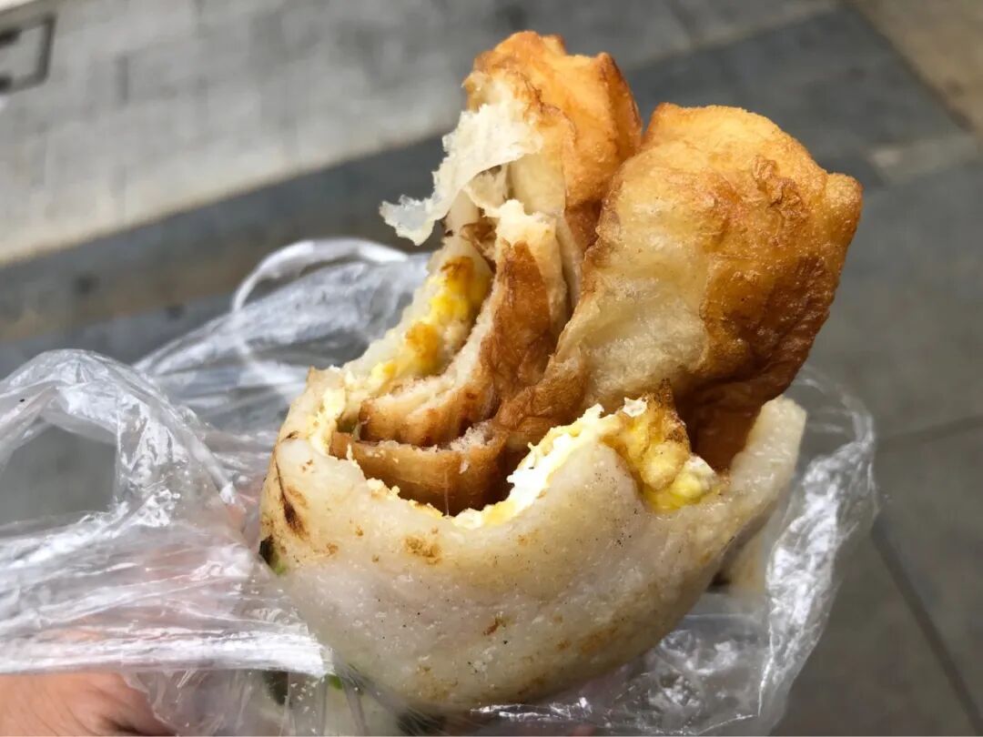 猪油糕加鸡蛋油条。用猪油反复煎压的年糕,撒上葱花,放上鸡蛋和酥脆的油条,再反复煎压,一口下去咸香又软糯。我没有买豆腐脑或者豆浆,咬了一口也没再多吃,我还要赶去下一家呢。