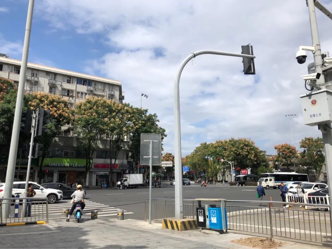 中午的气温有点升高,但风吹过仍算凉爽,路口车水马龙,树冠处都是我叫不出名字的花,云淡天高。