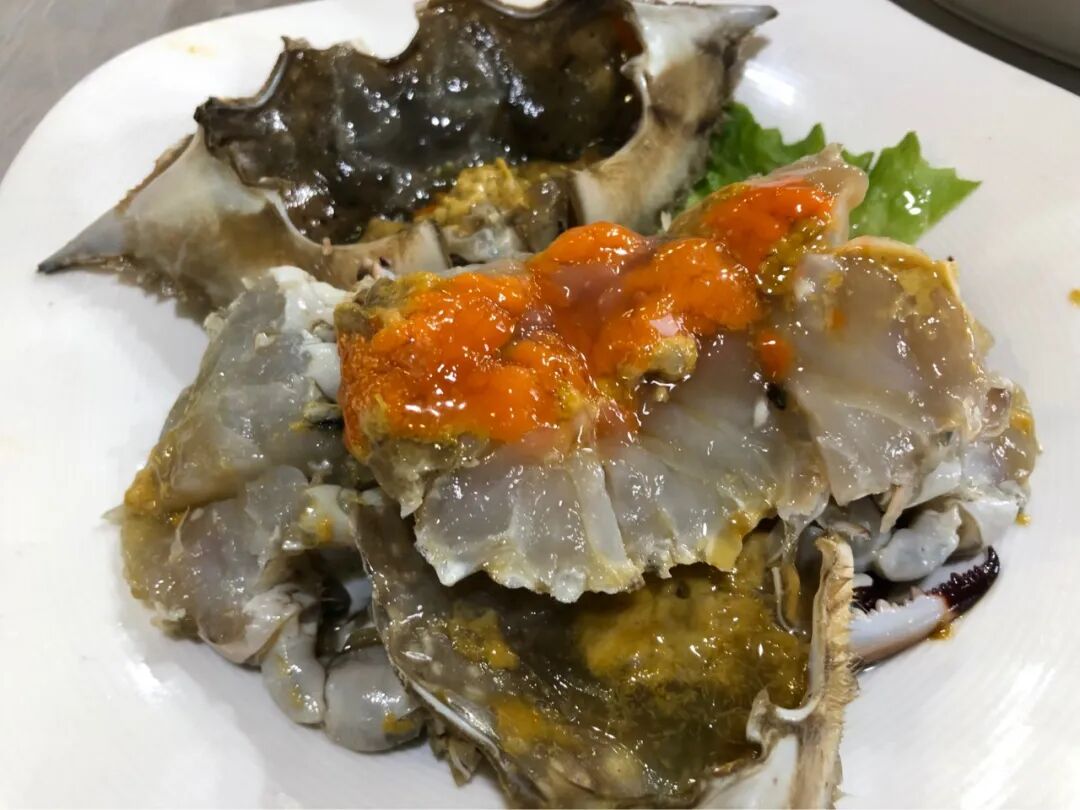 我终于吃到了心心念念的呛蟹,一盘2只才60元,虽然膏还不是很多,没到时候呢,但已经很满足了。蟹膏蟹肉抿在嘴里,那种鲜美、绵柔、甜爽,真是口腹之欲的极致享受。我想不明白为什么生和熟的口感会有那么大的差别,说实话我也担心吃生的会有寄生虫和闹肚子,但这美味真是无法抵抗的诱惑。