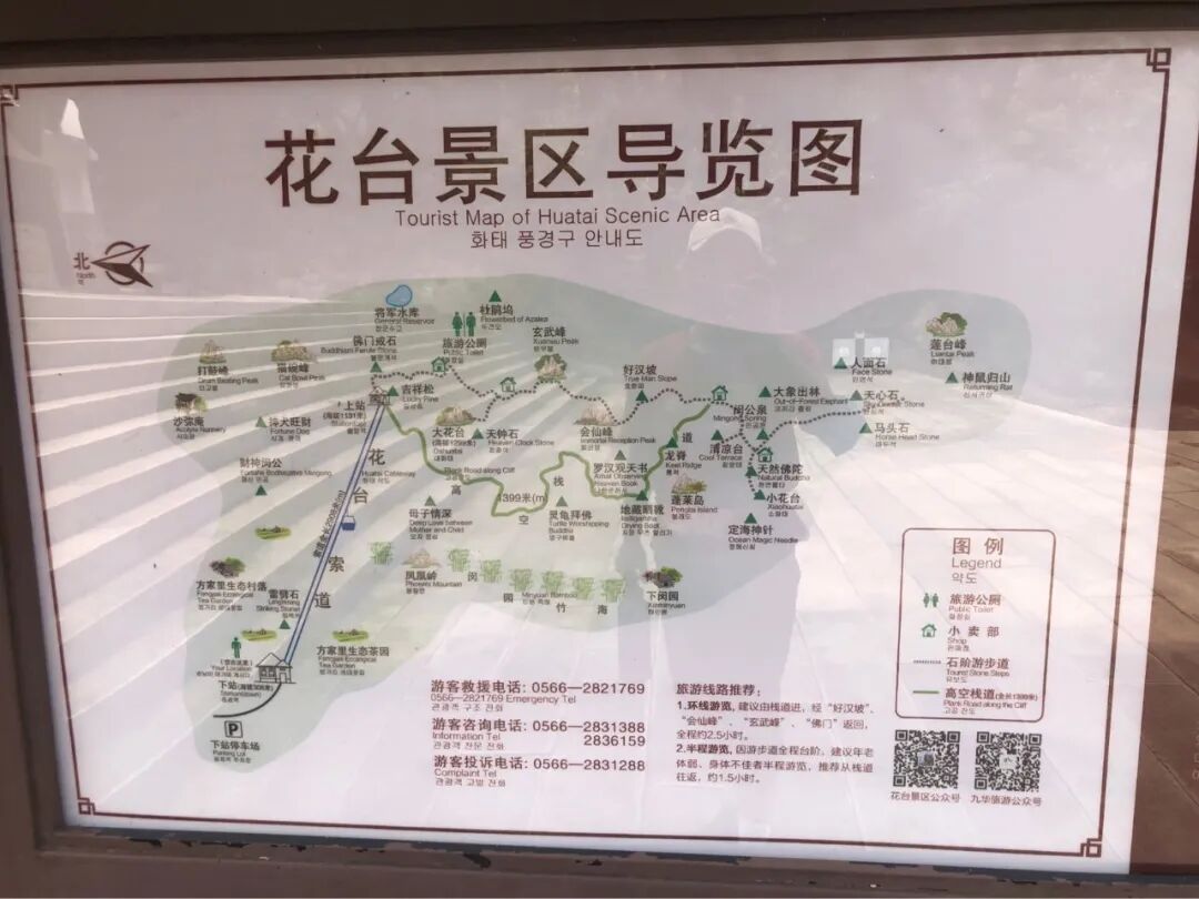 索道到山顶,出来就是栈道。整个花台景区,前半段是栈道,只有一点台阶,很轻松;后半段全是台阶,很累,体力不好的可以顺栈道再往回走,愿意爬山的,后半段可以走全台阶的山路。