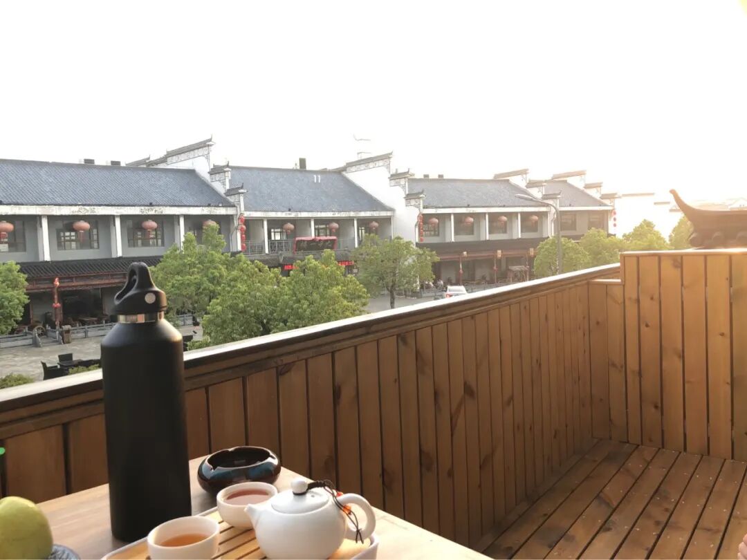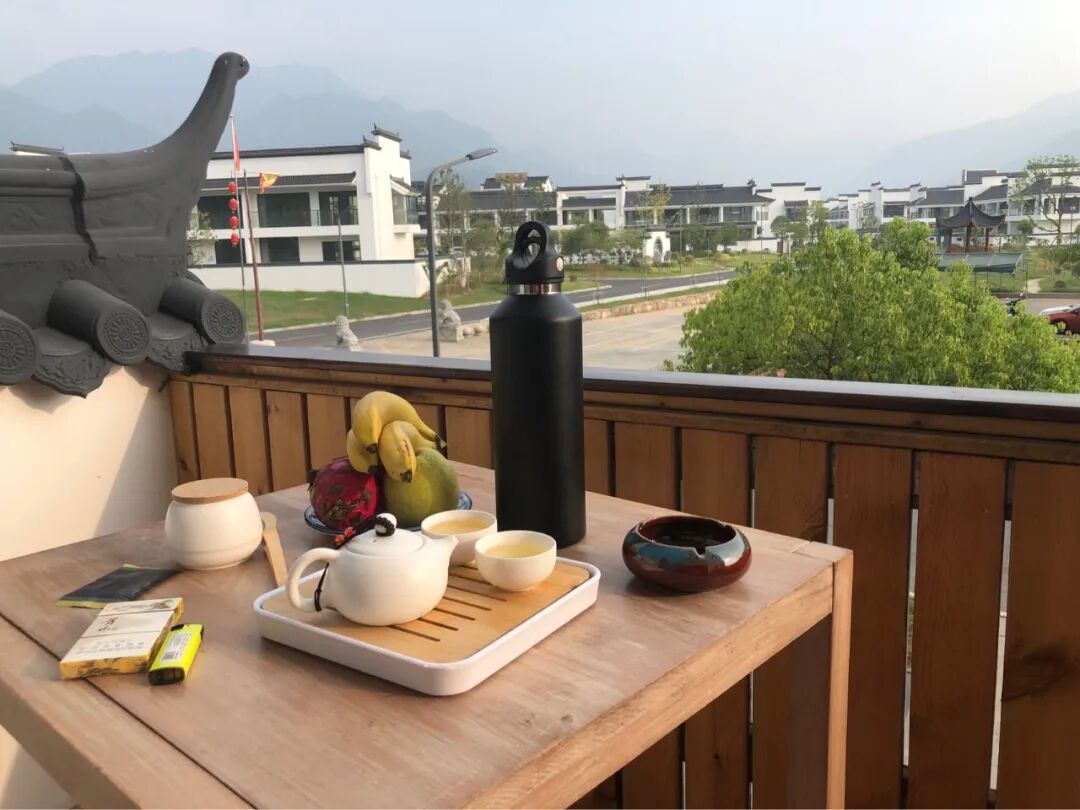 下午2点左右下山,回到民宿,换了一间有阳台的房间,我昨天就惦记这间房了,阳台上有木制的桌椅,有茶具,视野广阔,近处是徽式建筑的低矮民宿、饭馆,远处是层峦叠嶂的山。
