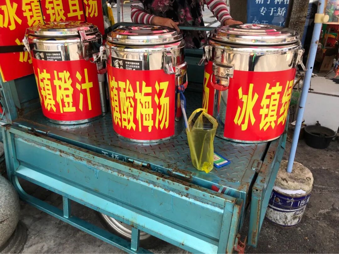 5块一杯、8块两杯,我今天没带水壶,渴得很,喝了一大杯绿豆汤和一大杯酸梅汤。