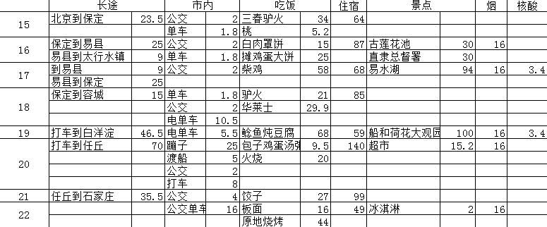 住宿方面随着经验的积累,花销持续的在往下走,比如我在邯郸住了两天每天只要53元,住在内黄只要44元,而且住的还挺好的。现在在隔离没有住宿支出。
