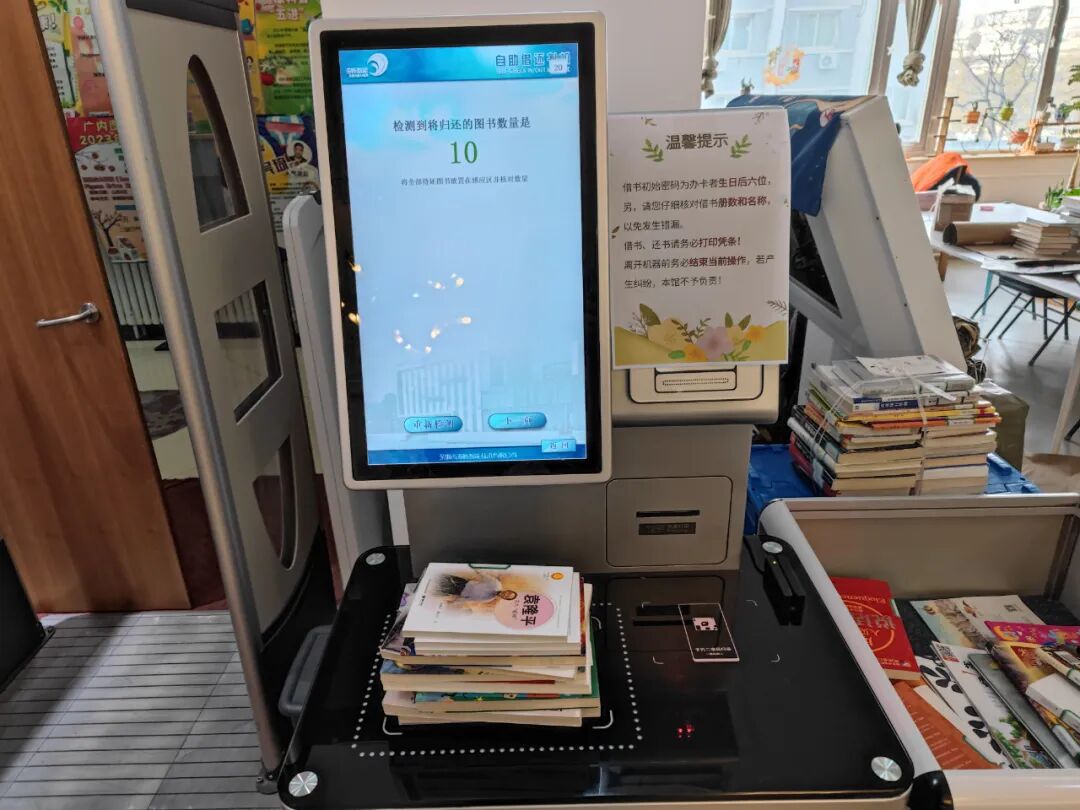 还书借书都是自助式的,书放在机器上,自动识别。