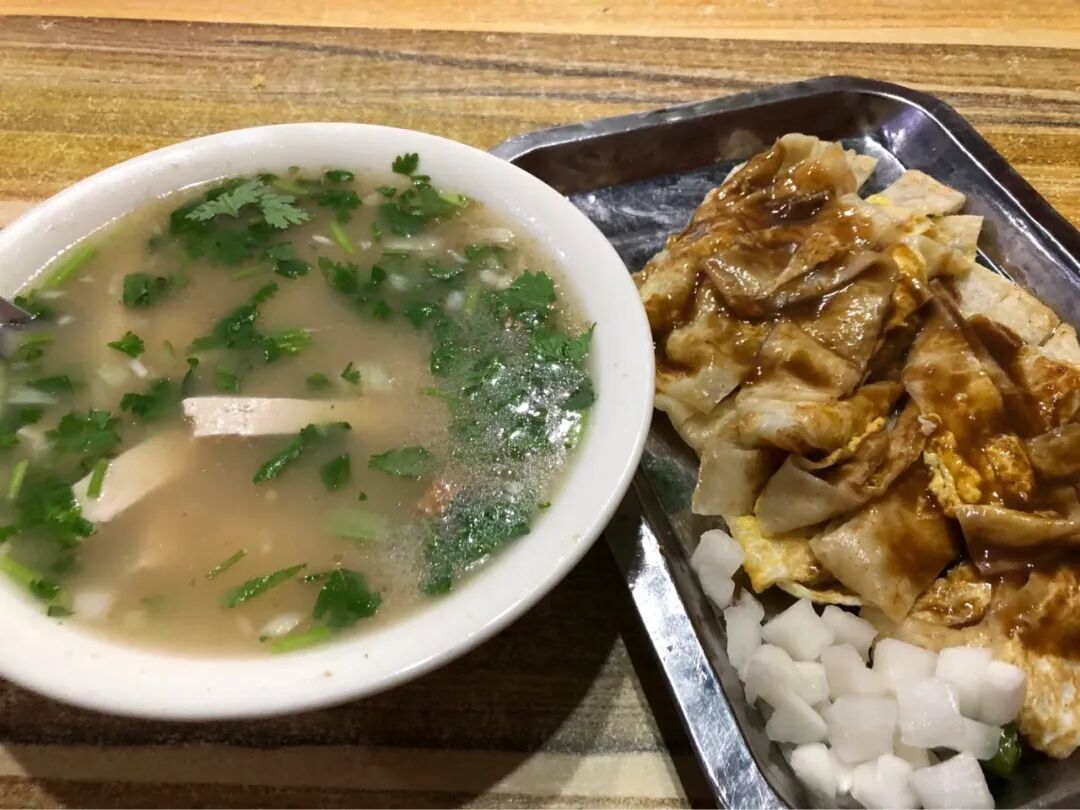 左面是一碗老豆腐和炸豆腐切成丝的豆腐汤,4元,右面是葱花饼,切成条刷了酱,4元。