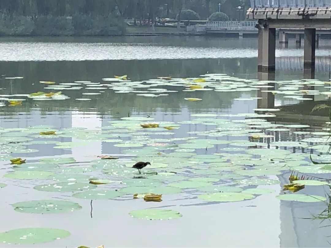 有一只不知道是什么品种的鸟,站在荷叶上自己玩。