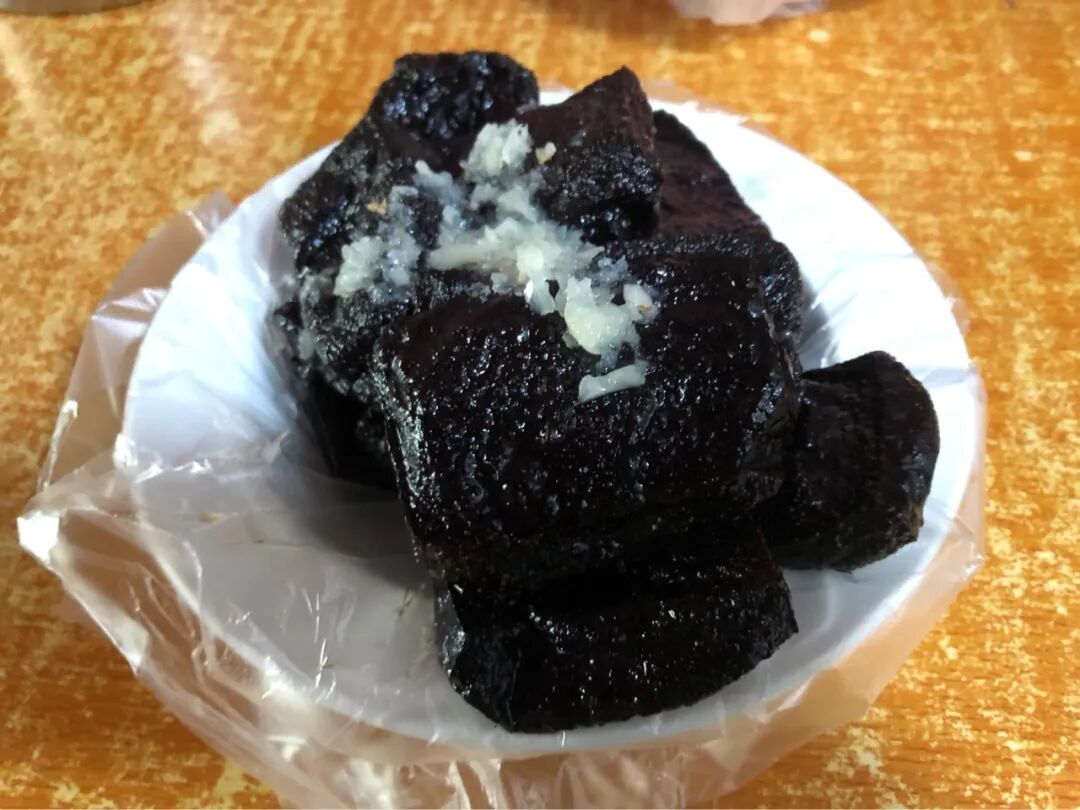 我是第一次吃这东西,口感有点像北京的灌肠,蒜汁加外焦里嫩,还挺好吃的。一份5元。